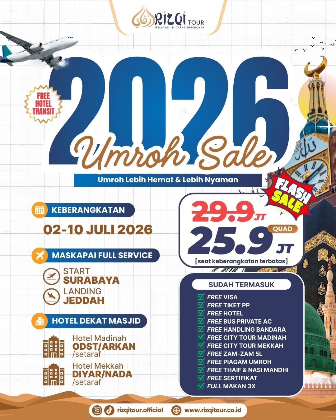 Nikmati perjalanan ibadah umroh yang nyaman dan tenang selama 9 hari dengan menggunakan maskapai Internasional Full service. Paket Umroh reguler ini tersedia untuk 35 jamaah, dengan jadwal keberangkatan 02 hingga 10 Juli 2026. Didukung pelayanan profesional dan fasilitas terbaik, Paket Umroh Reguler siap menemani ibadah Anda dengan aman, nyaman, dan penuh keberkahan.